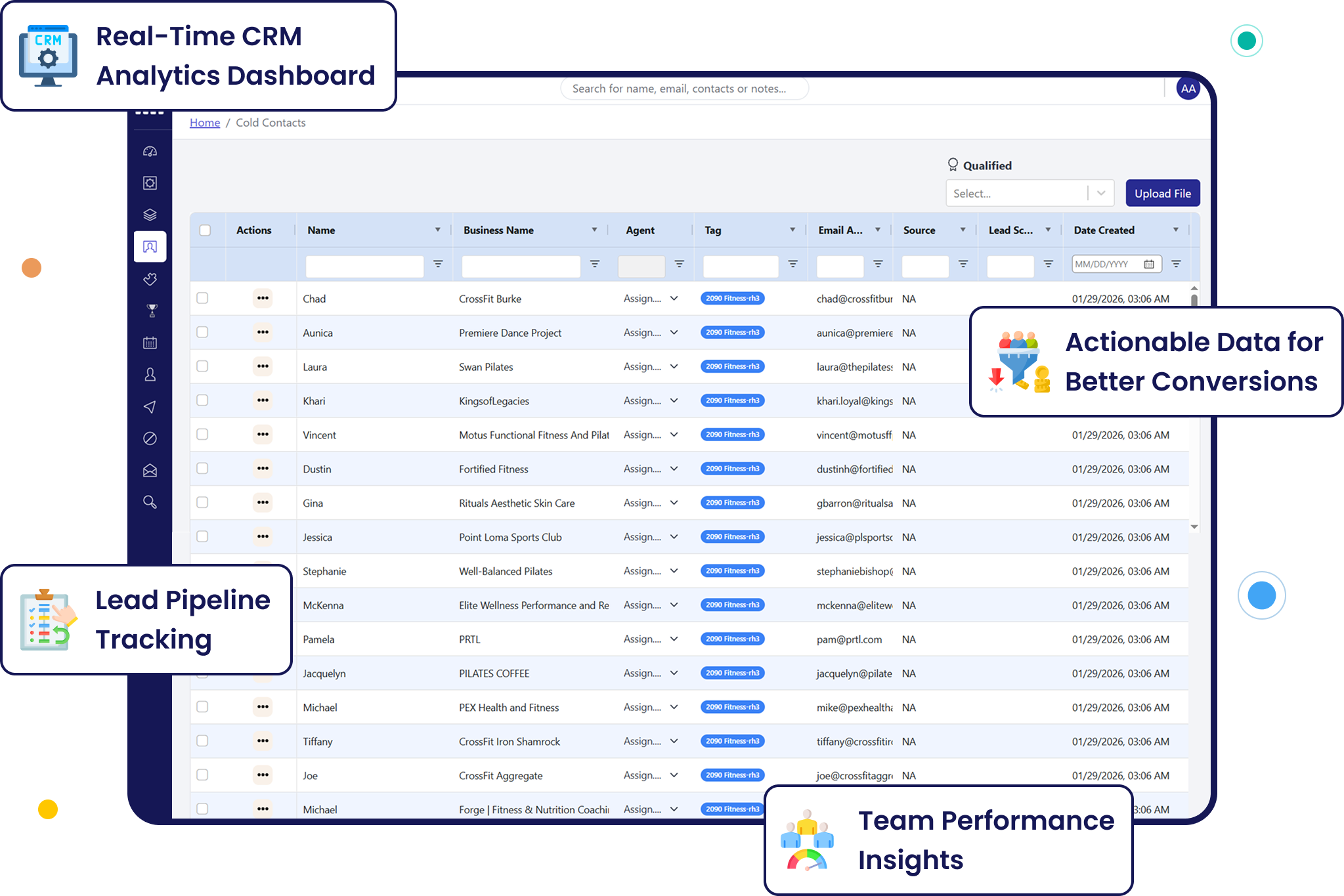 One compiled view of every lead across all stages. Sort, filter, search, and take action without switching between tabs or spreadsheets. This is your command center for the entire pipeline.